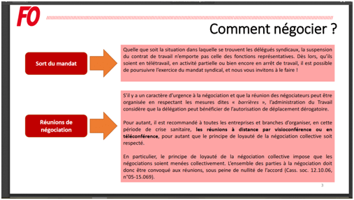 Ainsi, la liste des objets possibles de négociation (voir les diapositives à partir de la page 14 du document à lire ici) renseigne-t-elle sur la manière dont, en 2020, une organisation syndicale appréhende le champ de la négociation collective, ce qu’elle y inclut, ce qu’elle priorise. La liste que dresse FO est la suivante : « Négocier un accord de méthode », « Négocier sur le fonctionnement du CSE », « Négocier sur le télétravail », « Négocier sur la prime Transport », « Négocier sur la prime exceptionnelle de pouvoir d’achat », « Négocier sur le maintien de salaire en cas de recours à l’activité partielle », Négocier sur les congés payés, Jours de RTT et Compte-épargne temps, à la suite de l’ordonnance du 25.03.20 », « Négocier sur l’aménagement du temps de travail », « Négocier un accord de performance collective (APC) ».