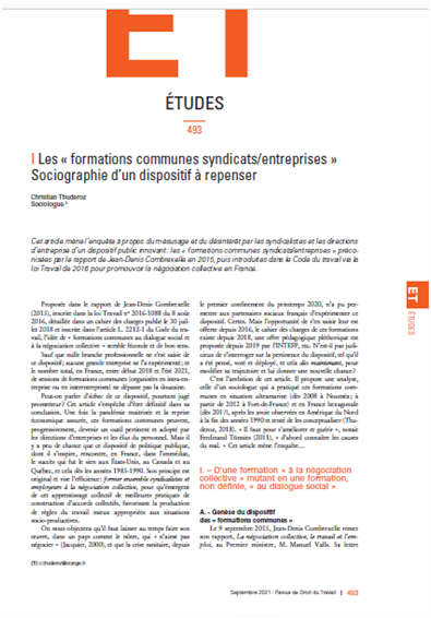 « Proposée dans le rapport de Jean-Denis Combrexelle (2015), inscrite dans la loi Travail n° 2016-1088 du 8 août 2016, détaillée dans un cahier des charges publié le 30 juillet 2018 et inscrite dans l’article L.2212-1 du Code du travail, l’idée de « formations communes au dialogue social et à la négociation collective » semble féconde et de bon sens.