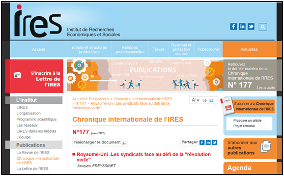 (Je reproduis ci-dessous le début d’un (fort intéressant) article de Jacques Freyssinet, professeur émérite d’économie et chercheur associé à l’IRES, l’Institut de Recherches Économiques et Sociales, intitulé « Royaume-Uni. Les syndicats face au défi de la révolution verte » et publié dans le (fort intéressant) numéro 177 de la Chronique Internationale de l’IRES, mars 2022. Notre collègue conclut son article en indiquant que « C’est donc au niveau des entreprises ou des lieux de travail que des avancées ont été principalement recherchées. Elles ont rarement pris la forme d’accords collectifs et consistent le plus souvent en une association, plus ou moins formalisée, des syndicats à une politique de l’entreprise. Les directions peuvent y recourir dans le cadre de leur politique de communication vis-à-vis d’une opinion publique sensible à ces questions ou parce qu’elles jugent utile d’éviter par ce moyen une éventuelle opposition de leur personnel, voire d’obtenir son adhésion aux objectifs de l’entreprise. Ainsi, des syndicats ont pu légitimer leur intervention, jouer un rôle actif et susciter de nouvelles motivations de militantisme. »…)