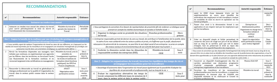 Quatre, ce rapport constitue une belle opportunité donnée aux partenaires sociaux, syndicats et patronats, de s’attabler ensemble pour, dans le droit fil des ANI précédents, élaborer et signer de nouveaux accords-cadres nationaux interprofessionnels, incitatifs ou normatifs, certes sur les sujets signalés par Sophie Thiéry et Jean-Dominique Senard, mais aussi tous ceux, urgents, qu’ils pensent devoir inscrire à leur agenda. C’est également l’occasion donnée aux comités paritaires des branches professionnelles de redevenir actifs et s’emparer avec dynamisme et responsabilité des sujets qui leur sont proposés…