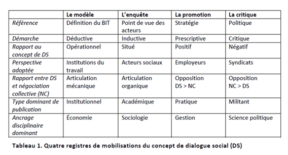 Le tableau ci-dessous résume ces quatre registres et leurs principales caractéristiques. Il illustre l’étendue des différences d’interprétation du concept de « dialogue social » :