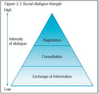 Les travaux et études publiés sous la bannière l’OIT illustrent cette première conception du « dialogue social » : un ensemble d’activités d’échange, hiérarchisées en fonction du degré d’association des salariés et de leurs représentants à certaines décisions de gestion. Le dessin d’un triangle ou d’une pyramide, vient illustrer cette hiérarchisation (voir ici celui proposé dans le rapport Key Features of National Social Dialogue: A Social Dialogue. Resource Book, Geneva, ILO, 2003, reproduit ci-dessous).