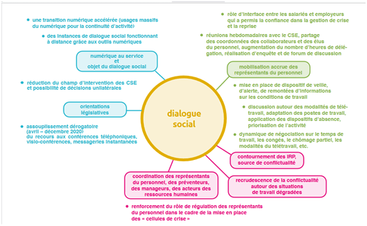 Au-delà des spécificités des discours syndicaux, patronaux, juridiques, législatifs, académiques, etc. à propos de l’expression « dialogue social », apparaissent huit grandes familles notionnelles (présentées ci-dessous dans un ordre ne reflétant pas leur prépondérance dans les usages sociaux français). Ce sont :