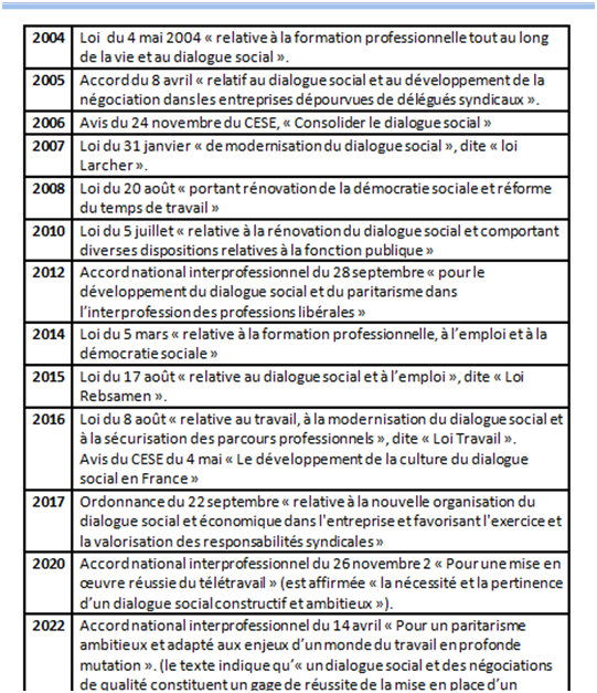Débutons ce parcours par une remarque linguistique. Comme l’indique le tableau ci-dessus, les titres des lois et accords interprofessionnels sont volontiers performatifs. L’expression « dialogue social » y est souvent mentionnée en complément d’un verbe d’action : il s’agit de développer le dialogue social (lois 2005, 2012), le consolider (loi 2006), le moderniser (lois 2007, 2016), le rénover (loi 2010), l’organiser (loi 2017), etc. De même, un jugement normatif est souvent porté sur ce dialogue social ; il doit être de qualité, constructif ou ambitieux (accords, 2010, 2020), voire éclairé et se situer au plus près du terrain (accord, 2023).