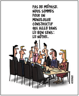 S’agit-il d’un problème de conception du « dialogue social », ou d’un différend sur les motifs pour lesquels ce « dialogue social » est dysfonctionnel ? Probablement les deux. Mais s’il n’ y a rien d’étonnant au fait que directions d’entreprise et représentants du personnel divergent à propos de ce qu’il conviendrait de faire pour que le « dialogue social » soit de meilleure qualité, il est surprenant qu’ils divergent à propos de ce qu’est (ou ce que n’est pas) le « dialogue social » en tant que concept. Y a-t-il désaccord entre nous sur ce que nous entendons dans nos communautés par « réunion de service », « groupe de travail » ou « assemblée générale du personnel » ?