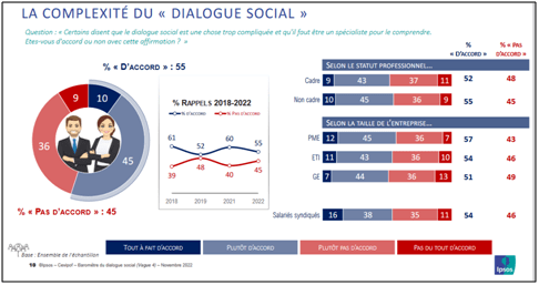 D’ailleurs : que veut-on prouver en interrogeant des salariés sur le caractère « compliqué » d’un phénomène non défini ? À vrai dire, je l’ignore ; je m’interroge même sur l’utilité d’une telle question : que faire en effet de l’opinion selon laquelle le dialogue social serait jugé « compliqué » : qu’il faudrait le simplifier ? Et à quoi ressemblerait un « dialogue social » « simplifié » ? La législation du travail à propos des IRP et de la négociation collective est peut-être un sommet de complexité ; mais le responsable de cette situation est le code du travail, pas le « dialogue social » lui-même !