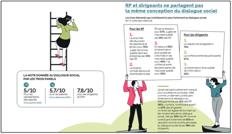 Quelques questions concernent le « dialogue social ». Les sondés sont ainsi invités à citer, parmi une liste (qui n’est pas communiquée in extenso au lecteur) « les trois éléments qui contribuent le plus fortement au dialogue social ».