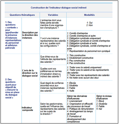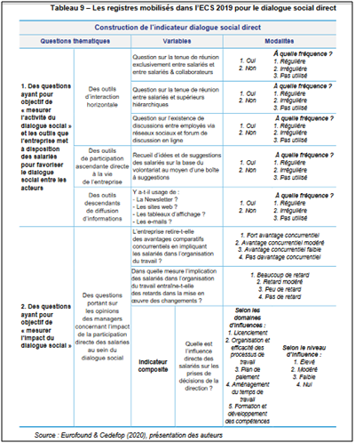 Un autre questionnement, à propos de l’aspect « performance des firmes », a consisté à regarder les items mobilisés par les économistes et statisticiens pour mesurer l’impact de ce « dialogue social » sur cette « performance économique ». Nous avons ainsi examiné la manière dont cet indicateur de « dialogue social » était construit. L’étude de la DARES et le travail d’Aguibou Tall, Dialogue social et performance, (lire ici) nous a permis de vérifier la pertinence de disposer d’indicateurs mesurant divers dispositifs et procédures (comme les séquences d’information-consultation du CSE) à travers des items très concrets, joints à des évaluations plus subjectives, le tout construit à partir des enquêtes ACEMO, opérées auprès d’un échantillon d’environ 14 000 entreprises (lire ici).