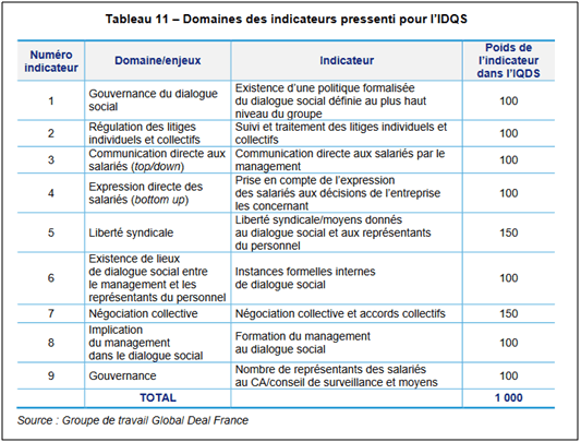 Le rapport final de 2021 indique à propos de cet outil : « Une dizaine de domaines “simples” sont donc retenus, avec pour chacun une gradation d’intensité avec différentes modalités possibles. Ces domaines vont de l’existence d’une politique formalisée de dialogue social au niveau du groupe, à la présence de salariés au conseil d’administration, en passant par la couverture des salariés par un accord collectif. Pour chacun, plusieurs niveaux, soit quantitatif soit qualitatif, permettent de graduer la pratique, dans une logique cumulative. Pour chacun de ces domaines, un nombre de points (sur 100) varie selon le degré de « performance ». À titre d’exemple sur la politique de dialogue social, un minimum de 30 points pourrait être attribué s’il existe une politique formalisée et communiquée en interne ; le score passe à 50 points si en plus la politique du dialogue social a été validée par le Comex, et à 80 si en plus elle est réévaluée par le Comex ou au Board au moins une fois par an ; le maximum est atteint si en plus il y a une extension au-delà des filiales et des seuls salariés d’une politique de dialogue social (à la chaîne d’approvisionnements : sous-traitance-fournisseurs, franchisés en promotion de la liberté d’association/syndicale : codes de conduite, politique contractuelle avec ses partenaires économiques, promotion de lieux d’expression ou de représentation des salariés, etc.). Chaque domaine est ainsi décliné selon une gradation et se voit attribué un poids, qui peut éventuellement varier, le tout pour parvenir à une note cumulative. »