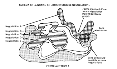 Roger Launay, dans un ouvrage malheureusement oublié, La négociation. Approche psychosociologique (1982) – et je suis toujours meurtri que nous n’ayons pas su faire fructifier, au sein de nos communautés disciplinaires, le savoir académique que nos anciens avaient su établir il y a une cinquantaine d’années… – avait modélisé ces négociations enchevêtrées, en parlant de « structures de négociation ». Le schéma de celles-ci était très fonctionnel : au temps T, une négociation A, émergente, vient s’inscrire dans le champ social ; elle annonce une négociation à venir.