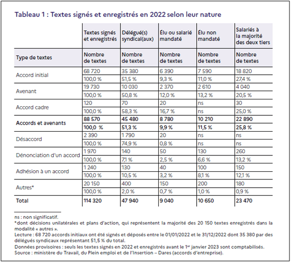« 114 320 textes de toute nature ont été conclus et enregistrés en 2022 auprès des DDETS, soit à concept constant, un volume en forte hausse par rapport à 2021 (+ 16 900 textes soit + 17,3 %). Cette activité dépasse le pic de 2019, où 103 700 textes avaient été enregistrés. Parmi ces 114 320 textes, 88 570 sont des accords initiaux, accords-cadres, renouvellements tacites d’accords (7) ou des avenants à un accord, soit 11 750 accords collectifs supplémentaires (+ 15,3 %) enregistrés par rapport à 2021. »