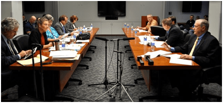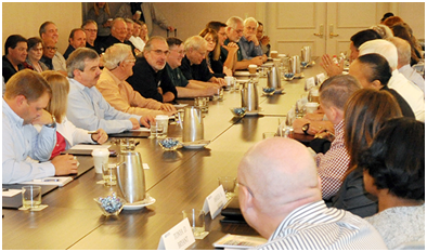 C’est pourquoi la « table » est un accessoire essentiel aux négociateurs : ils sont assis et en co-présence ; ils peuvent disposer leurs documents sur la table, pour les consulter, ou prendre des notes, etc. ; des tasses de café ou des viennoiseries sont à portée de main ; des micros peuvent être disposés devant eux, etc. Cette table peut être carrée ou rectangulaire, moins fréquemment ronde ou ovale (bien que « ronde » est recommandé dans les manuels contemporains, pour qu’à l’instar des chevaliers du même nom, à la cour du roi Arthur, ils peuvent ressentir leur égalité). Il peut s’agir : de tables distinctes, chaque membre des délégations se faisant face (photo 1 ; négociations entre la municipalité et le syndicat de la police de la ville de San Antonio, Californie) ; de tables distinctes mais rapprochées (photo 2 ; des syndicalistes sud-africains face à leur employeur ; tiré du site Labour Research Service) ; de tables distinctes mais contigües (photo 3 ; syndicalistes de l’US Postal face à leurs employeurs) ; d’une seule grande table (photo 4 ; négociations en mai 2024 entre l’U2P et les syndicats).