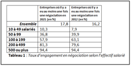 Les documents DARES-Analyses de novembre 2014 et DARES-Résultats de juin 2023, nous informent que les taux d’engagement en négociation selon l’effectif de l’entreprise étaient les suivants en 2021, comparés à ceux de 2012 :