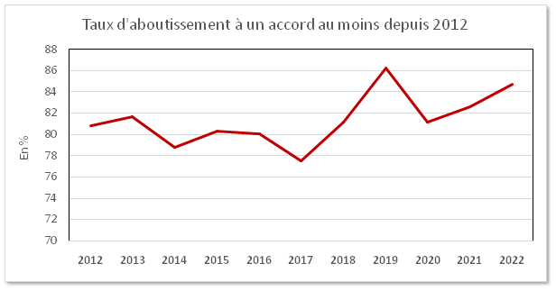 En 2021, en moyenne, 82,6 % des entreprises où s’est engagé un processus de négociation ont abouti à un accord collectif (voir le tableau ci-dessous). Chiffre encourageant, à première vue. Mais…