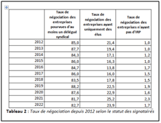Ce qui est une bonne et une mauvaise nouvelle. Bonne, parce que la présence de délégués syndicaux, formés et soutenus par leurs organisations syndicales, est gage d’une meilleure qualité de négociation ; huit sur dix processus de négociation collective relèvent de ce cas de figure. Mauvaise nouvelle, car la part d’entreprises dont les négociations impliquent des délégués syndicaux diminue depuis 2016 (et que recule la part d’accords collectifs signés par ces mêmes délégués syndicaux).