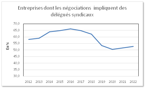 Facteur permissif : la présence de délégués syndicaux. Plus de 80 % des entreprises où se sont engagées des négociations collectives sont dotées d’au moins un délégué syndical – contre un peu moins de 25 % pour celles seulement pourvues d’élus au CSE ; et moins de 2 %, pour celles sans représentants du personnel.