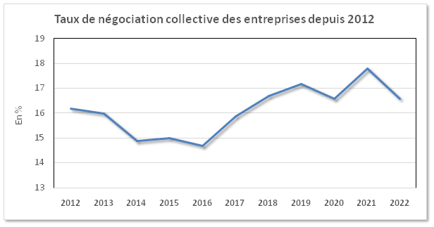 Entre 2012 et 2022, le taux de négociation collective des entreprises est passé de 16,2 à 16,6 %. Soit une hausse de zéro virgule quatre pour cent en dix ans ! Autrement dit, sur un stock d’entreprises d’environ 180 000 unités, il y a eu, en dix années, un peu plus de 700 entreprises nouvelles où des directions ont engagé au moins une négociation collective avec les représentants des salariés. C’est peu, on en conviendra, puisque les lois Rebsamen, El Khomry et les ordonnances de 2017 sont passées par là… Certes, ce chiffre de 0,4 est une moyenne sur 10 ans et, comme toute moyenne, ne rend pas compte des écarts annuels. Mais cela doit nous interroger. Il faut donc tenter de comprendre les motifs de cette quasi-stagnation… J’examine ci-après divers facteurs, à partir des chiffres et graphiques de la DARES.