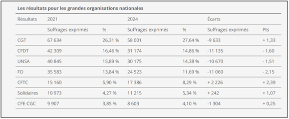 Au final, les grandes organisations nationales gardent le même classement qu’en 2017. Il faut aussi noter le résultat de la liste du syndicat des Gilets Jaunes qui a obtenu 6 846 voix (3,26 %), une mobilisation de ce courant issu de la crise du même nom mais qui reste somme toute relativement confidentielle. Enfin, dans le collège cadre, la CFE-CGC arrive en tête avec 25,2 % des suffrages en baisse de plus de 5 points par rapport à 2021, devant la CGT 19,83 % (+4,6 pts) et la CFDT 18,77 (-0,2 pt).