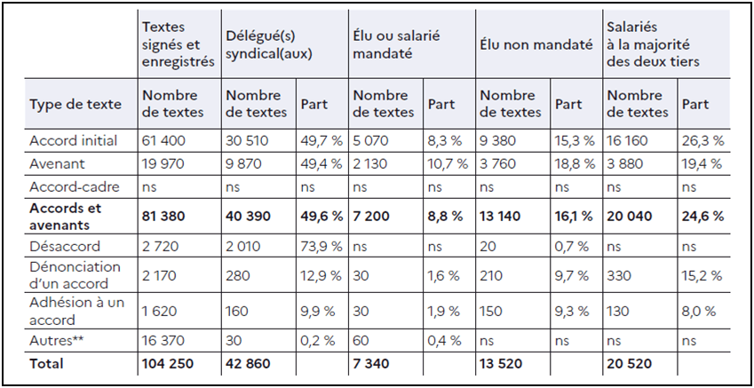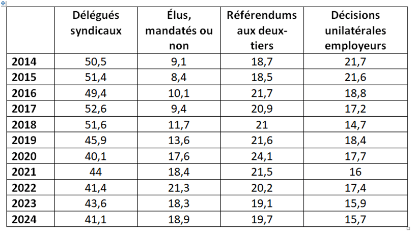 En 2015, 51,4 % des accords étaient signés par des délégués syndicaux, 8 % par des élus, mandatés ou non-mandatés, 19 % à l’issue d’une vote des salariés ; et 22 % étaient des décisions unilatérales, suite à un non-accord. Dix ans plus tard, cette répartition s’est transformée : 41 % des textes sont signés par des délégués syndicaux, 19 % par des élus au CSE ; le nombre des ratifications aux 2/3 est resté stables ; les décisions unilatérales représentent 16 % des textes enregistrées dans les DDETS.