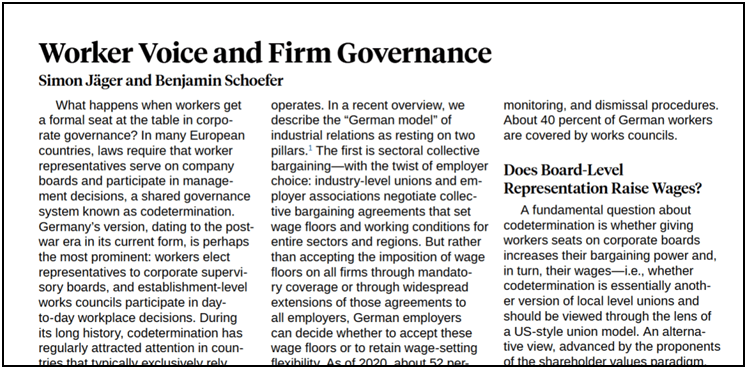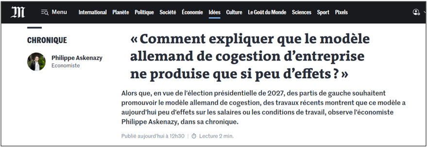 Comment expliquer que le modèle allemand de cogestion d’entreprise ne produise que si peu d’effets ? C’est le titre, en forme de question, de la chronique de l’économiste du travail Philippe Askenazy, ce mercredi 22 avril, dans le journal Le Monde (lire ici). Il s’adosse à une étude publiée dans The Reporter, le 9 avril dernier, Worker voice and firm governance, signée de deux économistes états-uniens, d’origine allemande, Simon Jäger et Benjamin Schoefer, le premier professeur à Princeton, le second à Berkeley (lire ici).