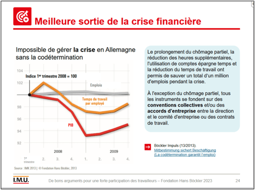 Que penser de ce raisonnement ? Qu’il est probablement juste. Ce que le profil de ces 4 courbes semble confirmer… Mais confirmer quoi, au fait ? Car une autre interprétation de l’identité de ces courbes est possible : elles ne prennent pas en compte, entre autres choses, les décisions prises en CA pour faire face aux multiples crises de la décennie 2000 en Allemagne. Si l’emploi était la variable étudiée, avec une hypothèse de type « Les entreprises avec co-détermination de leur gouvernance ont moins détruit d’emplois entre 2001 et 2009 que les entreprises sans co-détermination », je prends le pari qu’on constaterait des différences significatives dans ces courbes… D’ailleurs, une diapositive du DGB (photo ci-dessous) l’indique avec clarté :