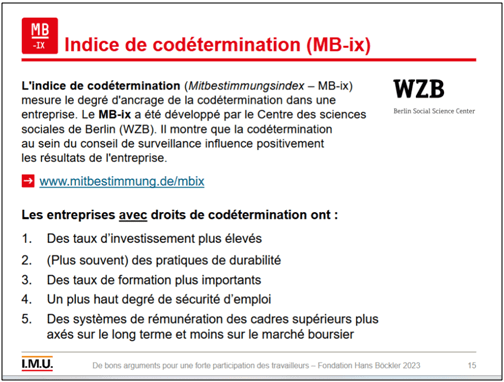 Quatre, la brochure de l’IMU, Institut fur Mitbestimmung und Internehmensführung (Institut pour la co-détermination et la gouvernance des entreprises, rattaché à la Fondation Hans-Böckler, proche du DGB, la confédération des syndicats allemands), dont la version française a pour titre Pourquoi la codétermination ? Un recueil de bons arguments pour une forte participation des travailleurs et travailleuses (lire ici) liste pas moins d’une trentaine d’effets positifs de la co-détermination en Allemagne. Ce sont, en vrac et à titre d’exemples : une meilleure rentabilité des actifs de l’entreprise, une meilleure trésorerie et une meilleure marge bénéficiaire ; une moindre évasion fiscale et une comptabilité plus rigoureuse ; des investissements dans l’outil de production plus importants ; le respect des objectifs sociaux et environnementaux, une meilleure protection du climat ; une meilleure motivation des salariés ; une meilleure égalité entre les femmes et les hommes, etc.